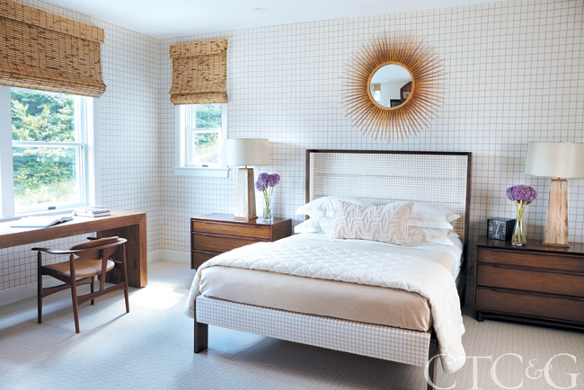 The master bedroom is a calm oasis, with a pale Stark carpet, Holland & Sherry wall fabric, window shades through JSJ Window Treatments and natural-reed table lamps from Daniel Barney. Bed linens are through the Linen Shop.