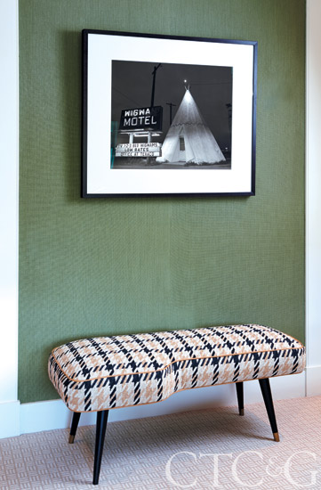 A Steve Fitch photograph from Kopeikin Gallery hangs over a 1950s bench covered in an oversized houndstooth fabric.