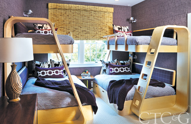 The bunk-bed design was inspired by the bent plywood creations of architect Alvar Aalto. A Loro Piana check covers the beds’ side panels. Bed linens throughout the house are from the Linen Shop.