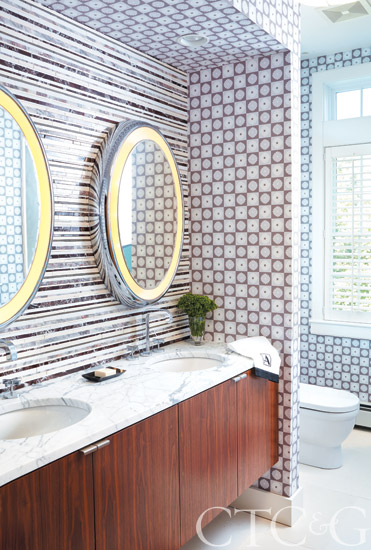 The backsplash of the girls’ bathroom vanity is a custom mosaic through Complete Tile Collection; mirrors are through Lightology; custom wallpaper is through Screen Reproductions.