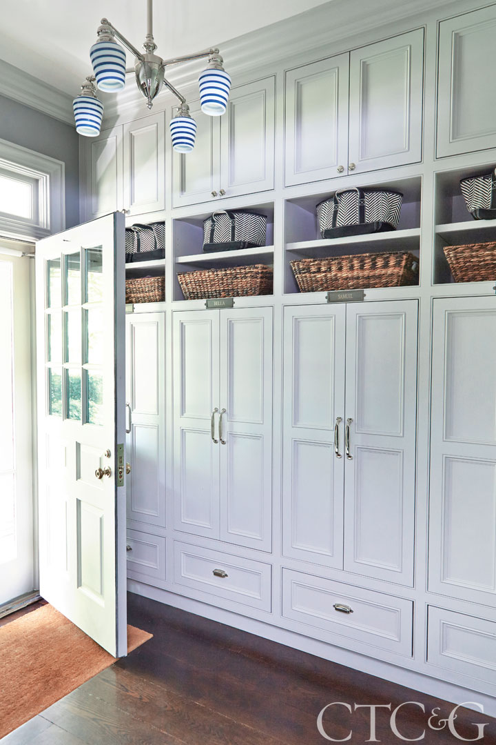 Built-in storage was created for all the children’s school supplies, sports stuff and musical instruments. Navy striped shades are from Schoolhouse Electric.