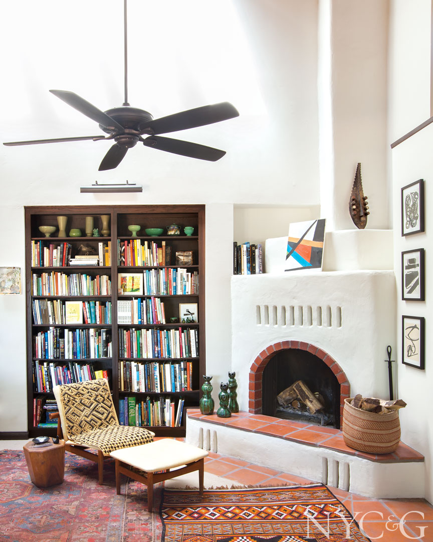 A vintage Finn Juhl chair and ottoman sit in front of the great room’s stucco fireplace. The African mask is from a trip Gunderman took to Mount Kilimanjaro.
