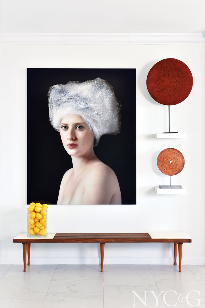 Hendrik Kerstens’s 2008 Bubble Wrap is displayed in the entry, along with a ceremonial African headdress and a feng shui clock. The wooden bench is vintage George Nelson.