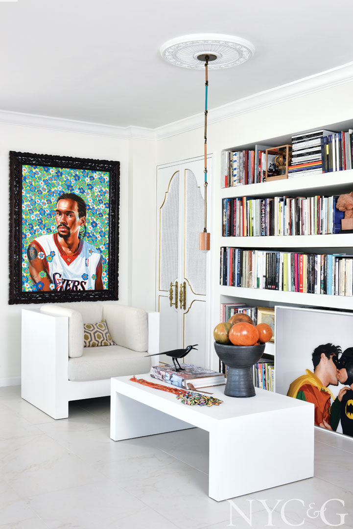 A work by Kehinde Wiley is displayed in a corner of the library; the pendant is a Lindsey Adelman design.