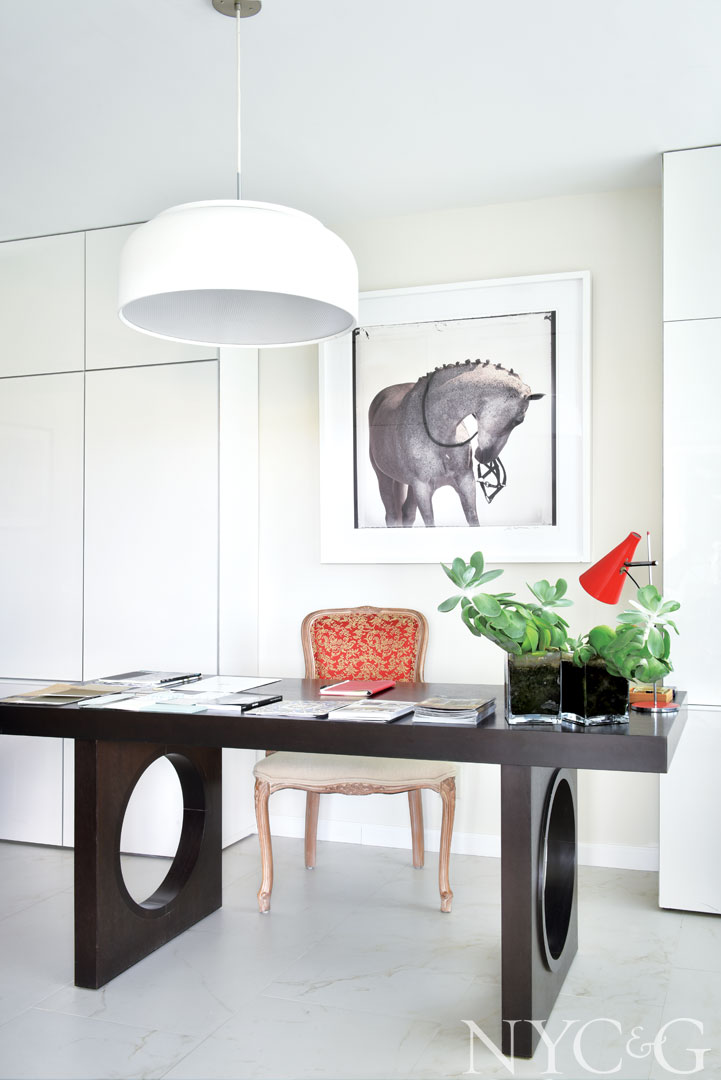 His office features an India Mahdavi–designed walnut desk for Ralph Pucci and a vintage light fixture from Visiona.