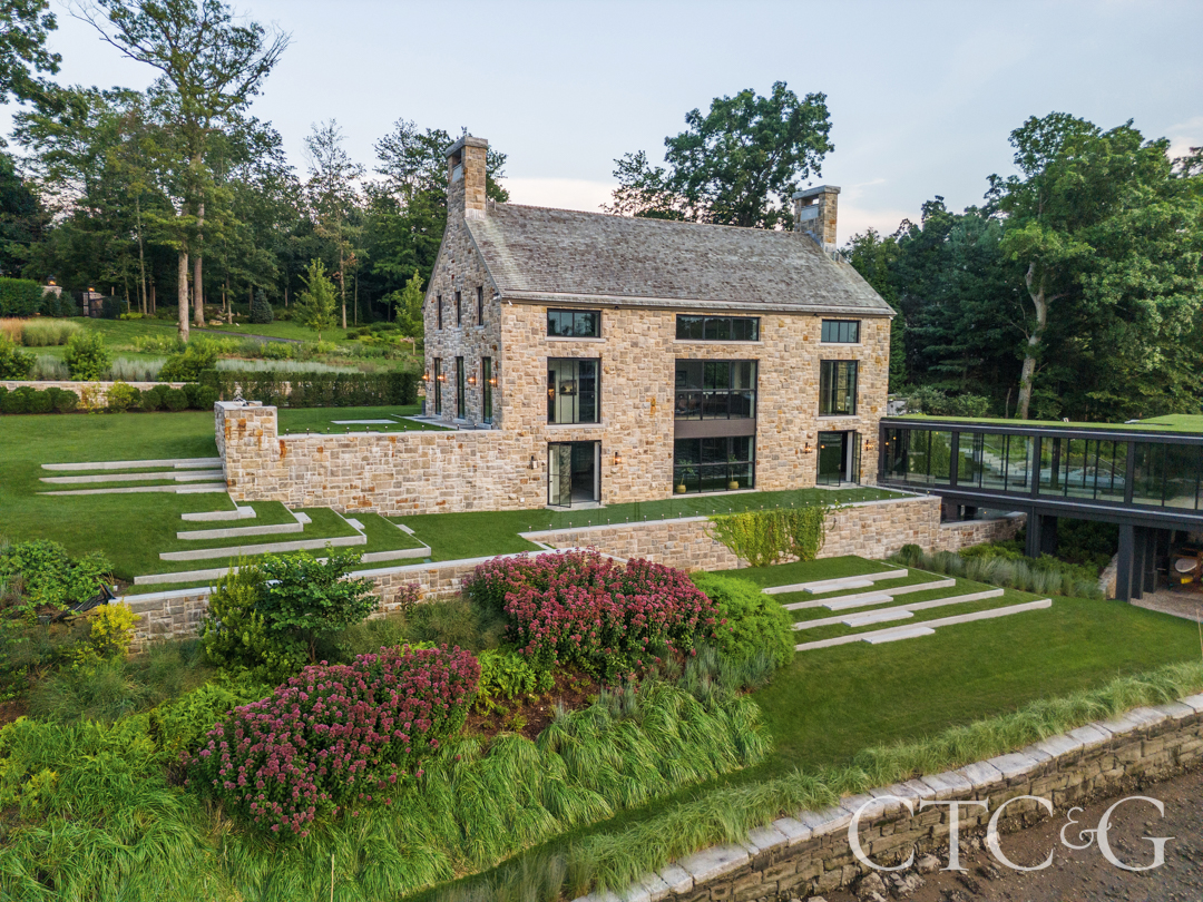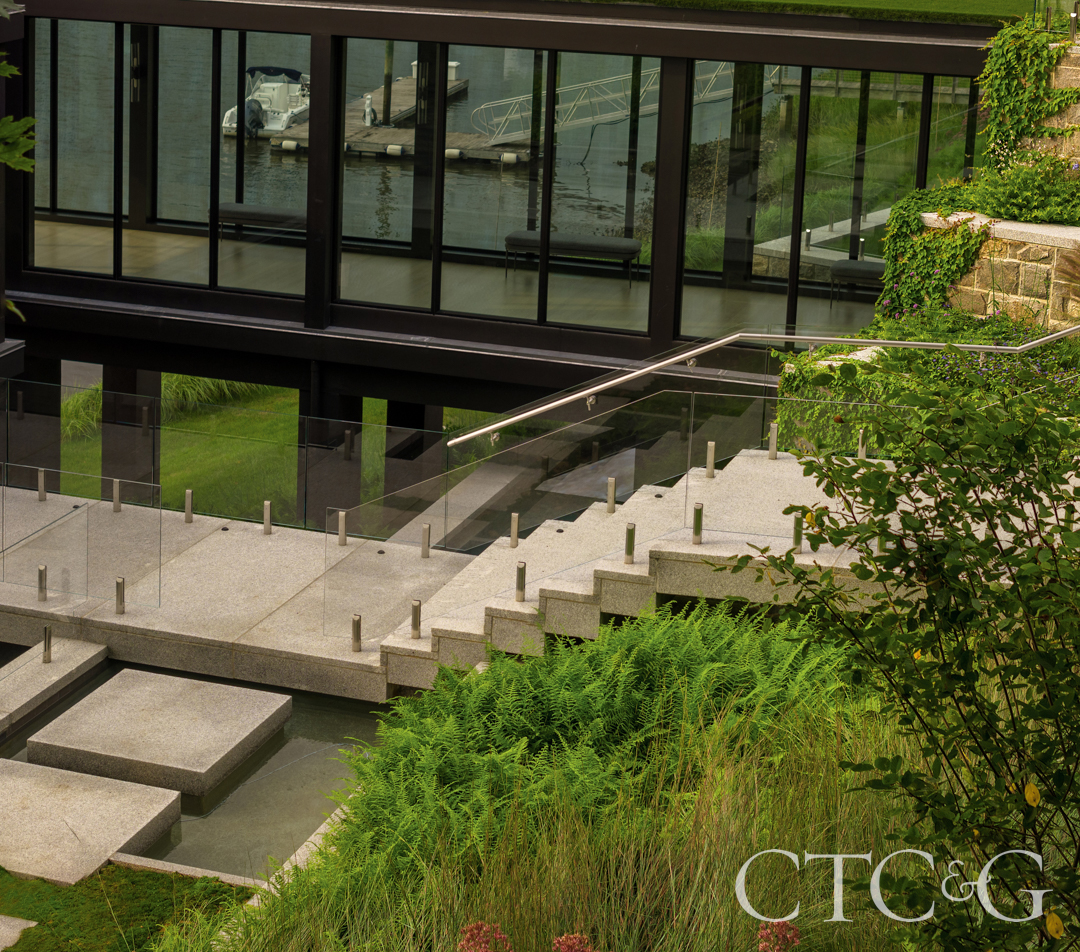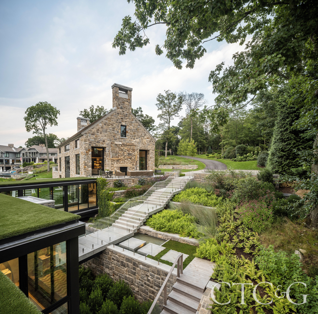 Even Mother Nature has difficulty taming a river or softening the grade of a hillside, but the landscape architects at Wesley Stout Associates managed to not only change geography, but also improve upon it. A picturesque site along the Saugatuck River in Westport features a new stone entertainment barn and a revamped boathouse as part of a residential compound. A 40-foot grade between the two structures presented a challenge, but the team designed a series of walls and subtle grade changes that appear to effortlessly cascade down the slope. A seemingly floating staircase links the two buildings, while vaulting beds of native plantings not only look beautiful but also serve to stabilize the riverbank. Meanwhile, at the back of the barn, illuminated “lawn steps” wrap an outdoor kitchen. A series of terraces on the main area of the grounds contain green lawn areas encased in sharply edged concrete barriers. The existing hill has, indeed, been tamed, while the course of the river and the habitat along it remain honored.