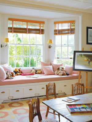 Creative Outlet | The playroom, features hand-painted floors and cheerful fabrics. On the easel: Maxi, Central Park, from Rattazzi’s book Children.