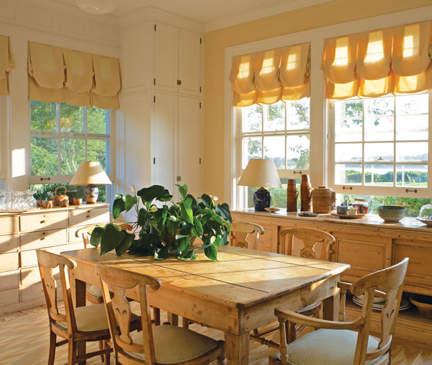 Pine Dining | The light-dappled guest house kitchen features soft Roman shades and a suite of sumptuous pine furniture, including a table from Vermont and chairs from Pierre Deux.
