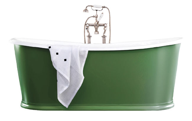 Splash of Color | Devon & Devon’s classic Regal bathtub is now offered in an array of colors, like this rich green. Regal features an enameled cast iron interior with a painted aluminum-lined exterior. $14,362 (with color added), through Klaff’s, Norwalk, 203-866-1603, Scarsdale, NY, 914-740-1800, klaffs.com, devon-devon.com.