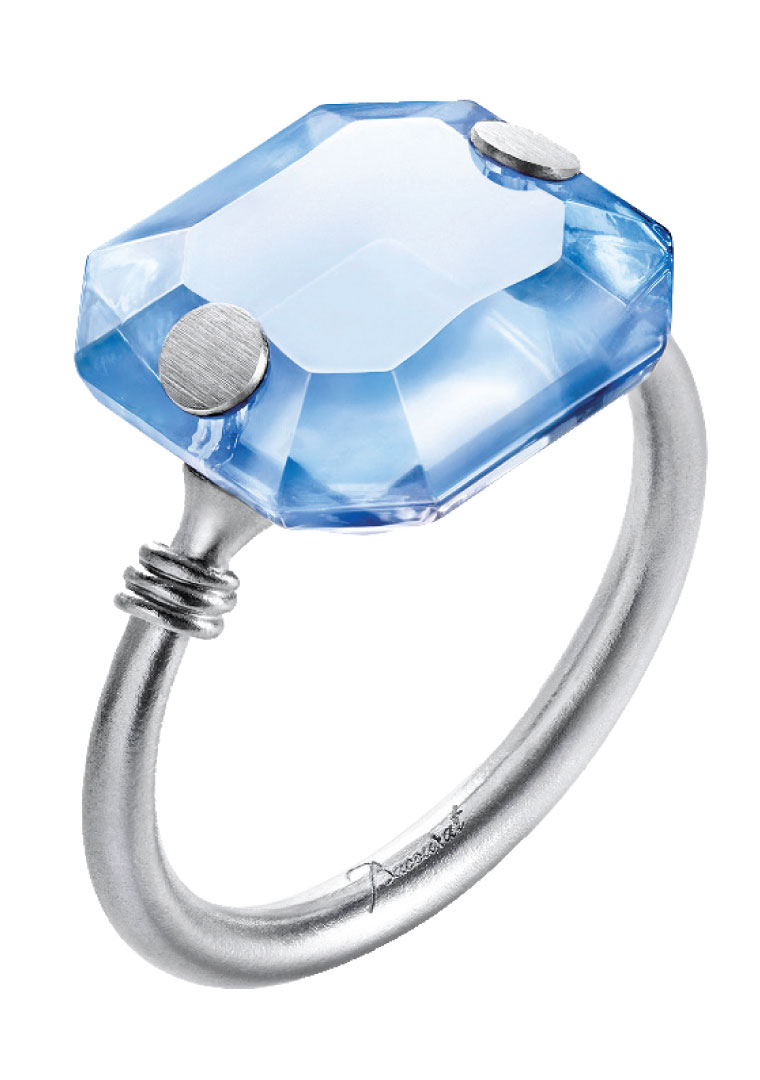 Marie Hélène de Taillac’s new sterling-silver rings for Baccarat feature a variety of gemstones, including light blue crystal, $420; 635 Madison Ave., NYC, 212-826-4100.