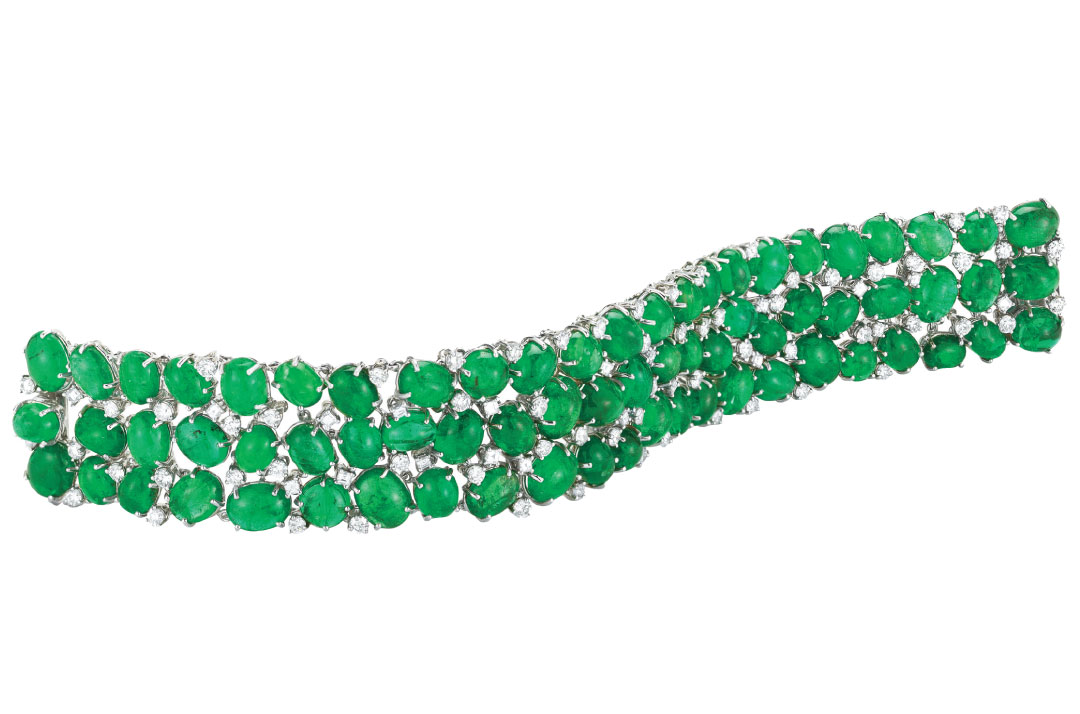 Cabochon emerald and diamond bracelet in platinum by Oscar Heyman, $194,500, at Neiman Marcus, 2 Maple Ave., White Plains, 914-428-2000.