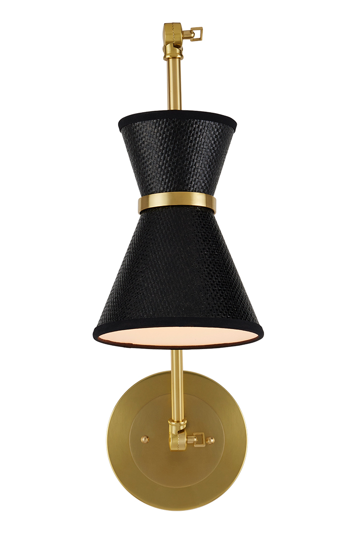 Designer Suzanne Duin of Maison Maison collaborated with Currey & Company to create the Avignon wall sconce. The fixture, in a polished brass finish, is highlighted with a black paper shade handwoven by artisans in Southeast Asia.