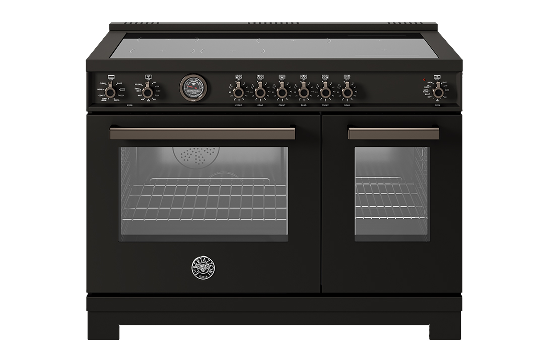 A first of its kind, the Bertazzoni Professional Series 48-inch Induction Range features one continuous cooking surface with a fully ceramic, black glass surface. The newest color option is Carbonio in a dark, matte graphite finish.