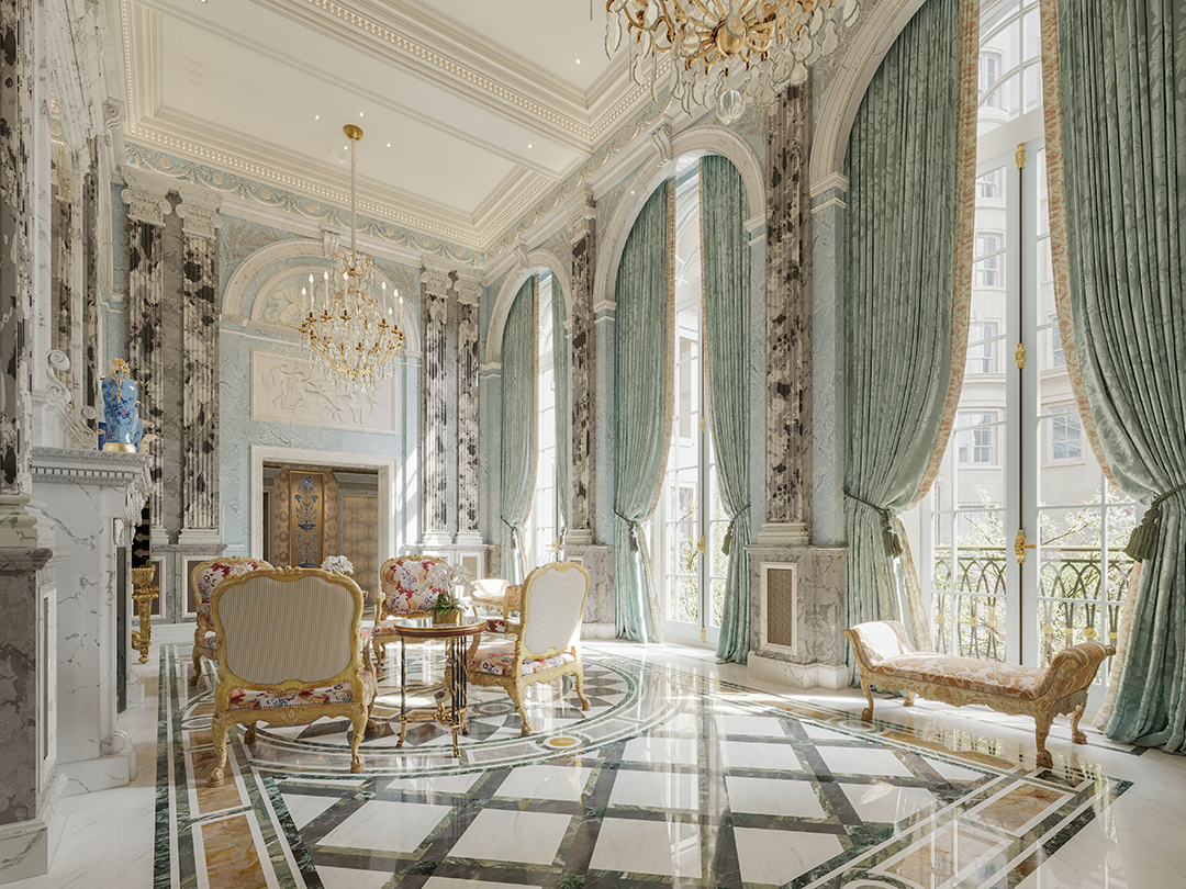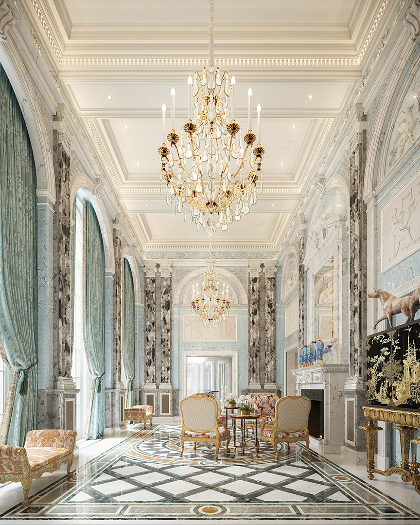 They tapped New York-based Robert A.M. Stern Architects and Paris-based, American-Chilean designer Juan Pablo (J.P.) Molyneux for the building’s design. Overseen with great care by Caudwell, it has been approached like a world-class luxury hotel, with extensive back-of-house facilities including secret doors, hidden corridors, staff stairwells and staff passenger lifts helping the service team to move discreetly throughout the development, almost like a modern-day ‘Downton Abbey.’ Residents can also expect lavish lounge areas, such as a grand reception room, a library, and a garden gallery, plus sanctuaries for wellness like the expansive health spa and courtyard garden.