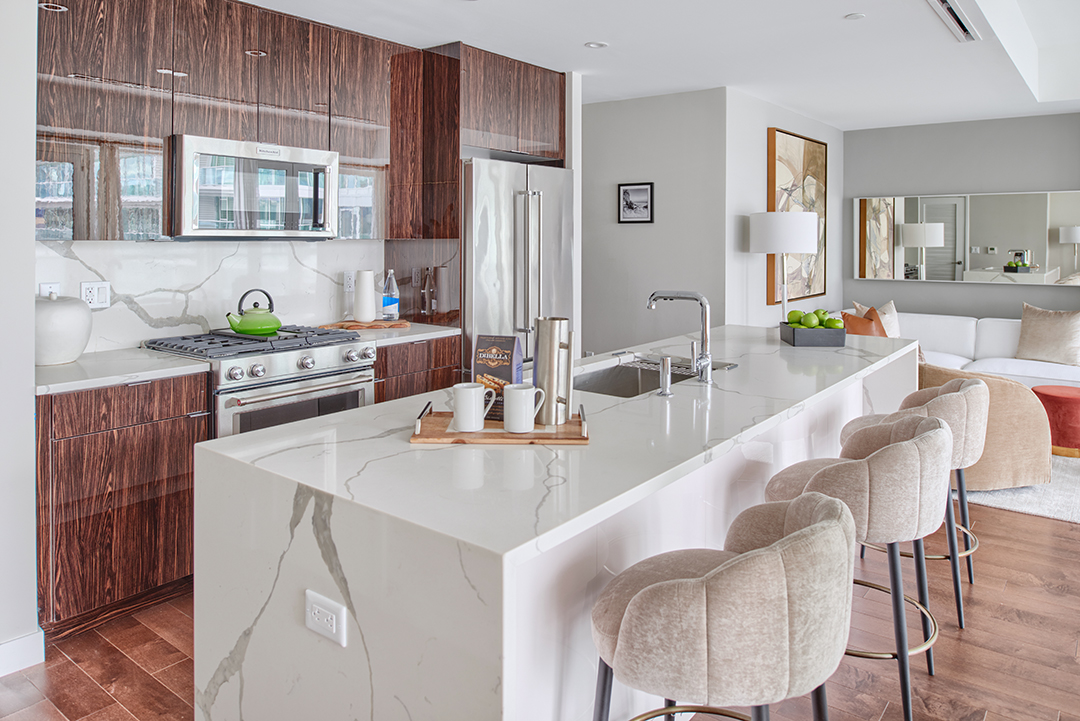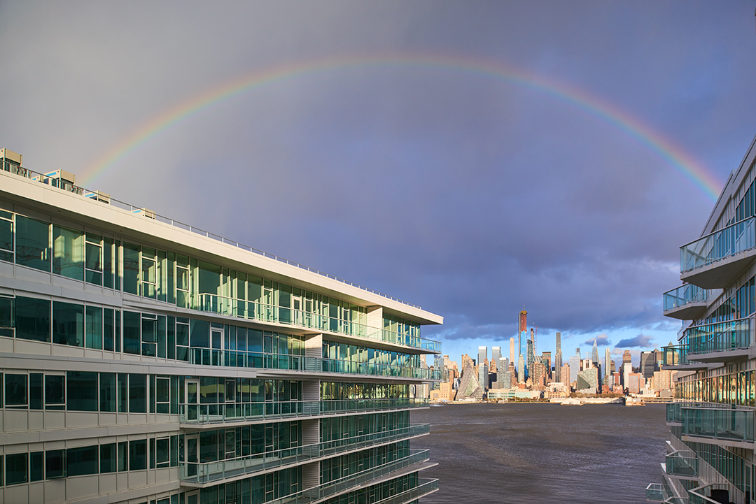 On the shores of New Jersey, the lights of Manhattan sparkle on full display. The blinding illuminations make for a stunning backdrop against the waterfront properties that line the neighboring coast. Among the luxury residences lies a new contemporary building called Avora at Port Imperial, located in Weehawken. The glass enclosed building offers top-notch amenities, while incorporating sustainable alternatives, to create a LEED-friendly community. Well-known architecture firm IBI Group spearheaded the project to form an attractive and environmentally friendly property.More than half of the building is already sold, but consumers still have to opportunity to scoop up Residence 812. To the tune of $1.315 million the 1,497-square-foot condo beckons buyers into its amenity-rich fold. The two bedroom, two bathroom unit boasts a bright, airy ambiance generated through full length windows. A gourmet kitchen outfitted with stainless steel appliances and quartz countertops sits at the heartbeat of the home, adjoined to the spacious living room. Cool color tones are used throughout the space, creating a tranquil environment.The building is situated mere minutes from the Waterway Ferry Terminal which offers a less than 10 minute trip to Manhattan. The listing has garnered plenty of buzz due to its modern yet sustainable conception as well as its proximity to the glittering shores of the Hudson River.