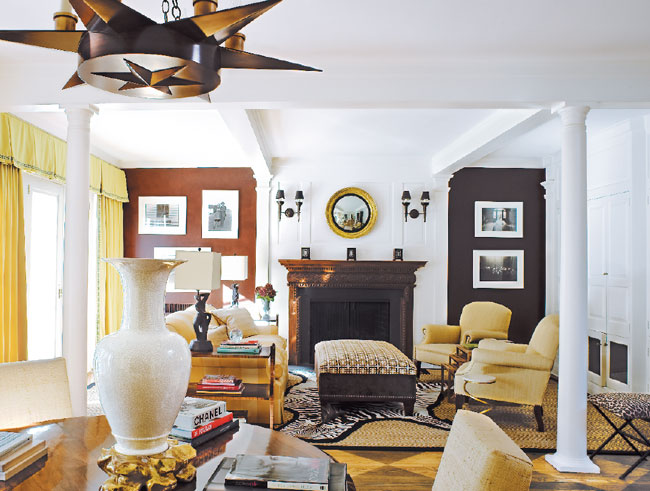 Winning Reception | The sofa and club chairs in the adjacent den are by George Smith; the sisal is from Stark. The antique Regency bull’s-eye mirror is a find from Henry Fender Antiques in Stamford, Connecticut.