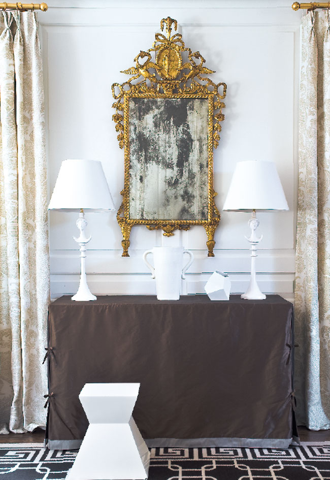 Double Vision | A console in the living room is skirted in Rose Cumming silk taffetas from Dessin Fournir. Lincoln designed the Giacometti style table lamps; the stool is from Janus et Cie.