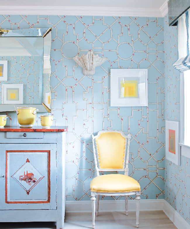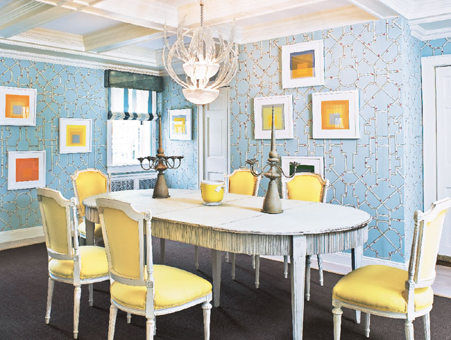 Dining By Design | The dining room features a cheery bamboo-print wallpaper by Scalamandré, a Murano glass chandelier, a suite of Josef Albers prints, and an antique Swedish table from Lief Almont in Los Angeles.
