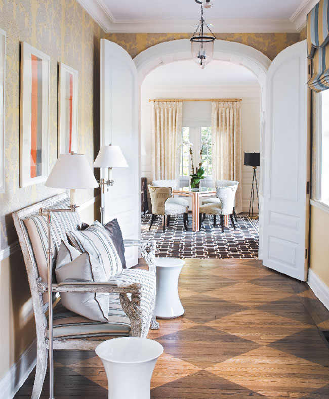 En Suite | In the main entry, Robert Mangold prints hang above a settee covered in a Claremont stripe.