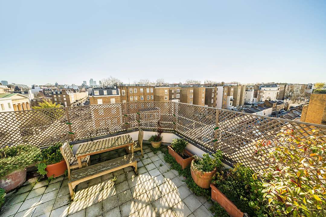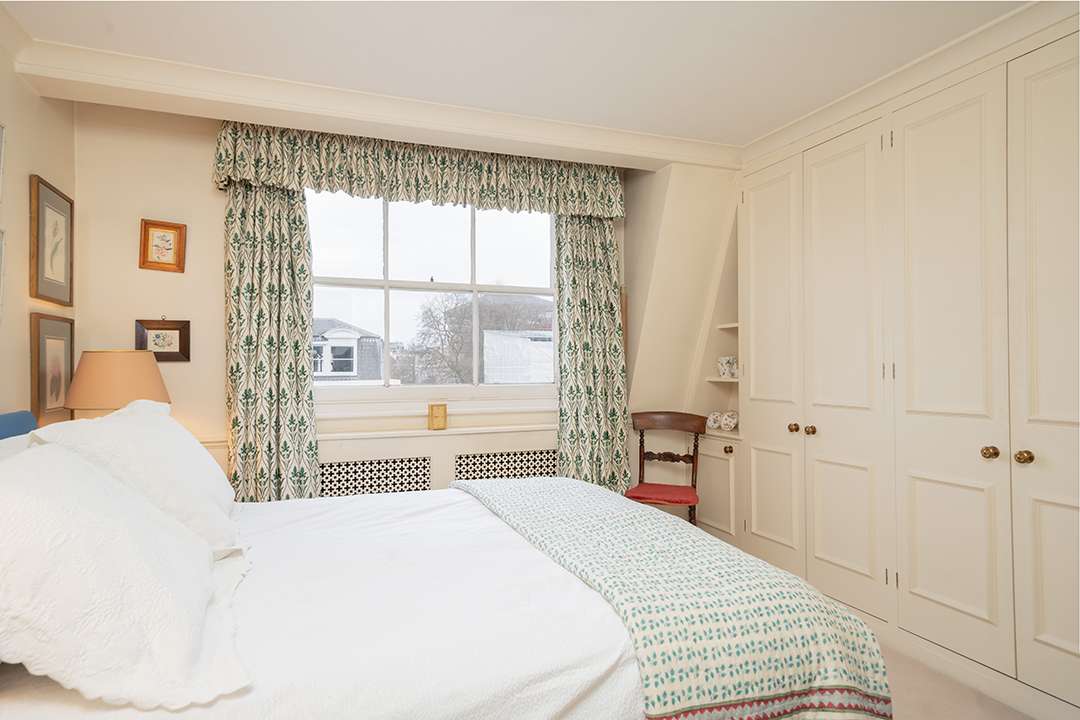 Still a vision of classic London elegnace, the 1,980-square-foot duplex occupies the third and fourth floors of the picturesque building. The third floor holds all the main living and entertaining spaces, while the upper level provides tranquil solace for all three bedrooms. A large terrace sits off the primary bedroom, setting the scene for peaceful mornings.