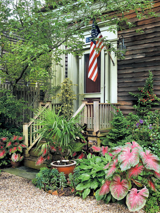Planters’ Punch | Outside the front door of their Sag Harbor rental, Mark Markheim and Philip Saunders have added pops of red—most notably a pair of chinoiserie-style chairs, red-splotched caladiums, and bright hibiscus—to offset the wide spectrum of greens.