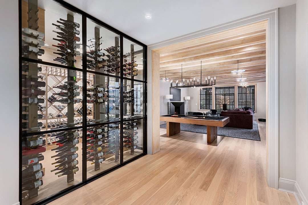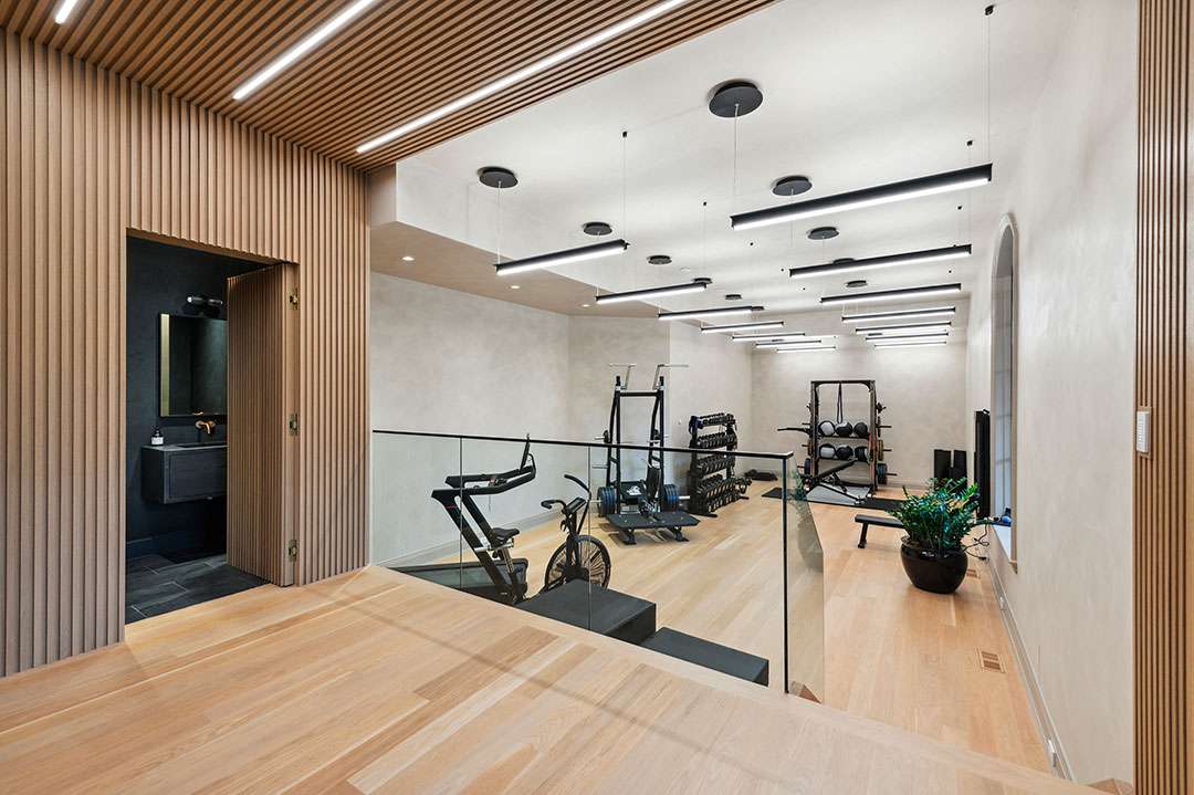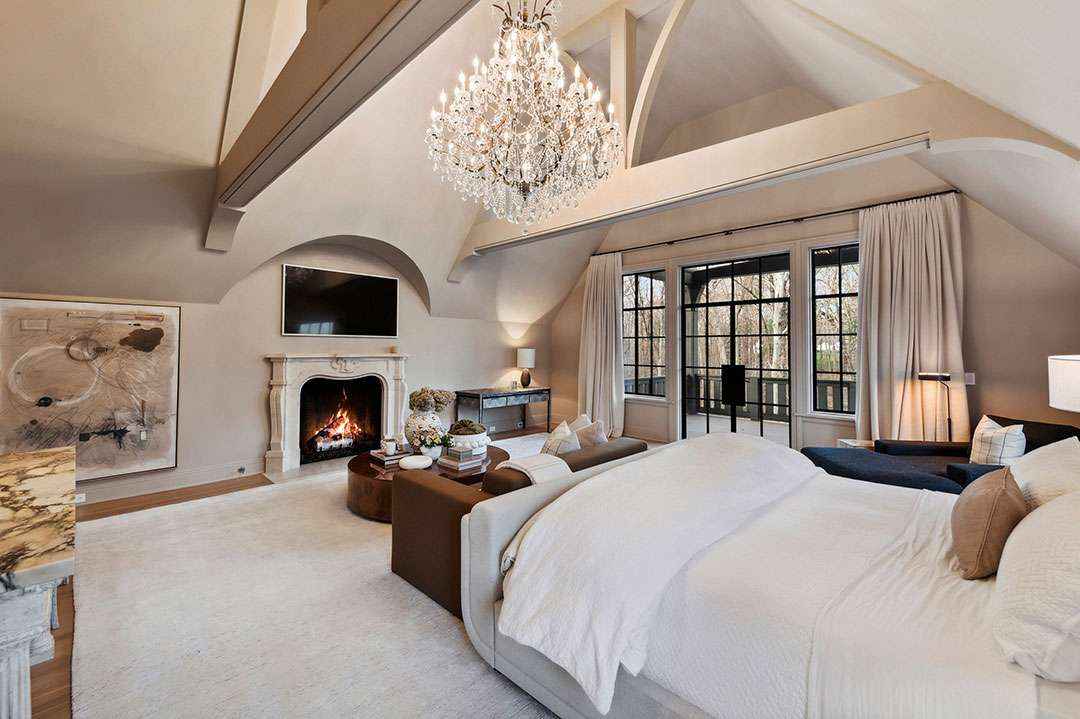 The 14,284-square-foot residence sits down a tree-lined driveway, behind a gate, on over 18 acres of land (the community requires each lot to be at least 10 acres to ensure the privacy). Plenty of formal and entertaining spaces unfold throughout the floorplan: A double-height entry, a living room, a mahogany-paneled dining room, a chef’s kitchen with a butler’s pantry, a fitness center, a spa area with a sauna, a wine cellar, and a full bar.