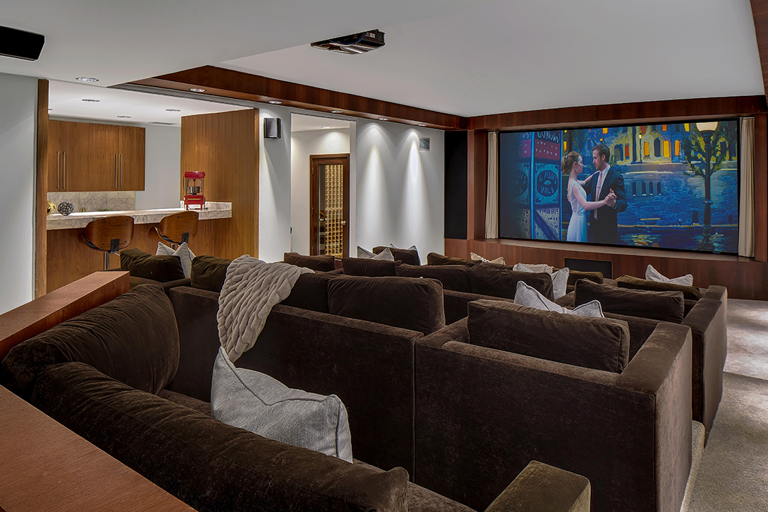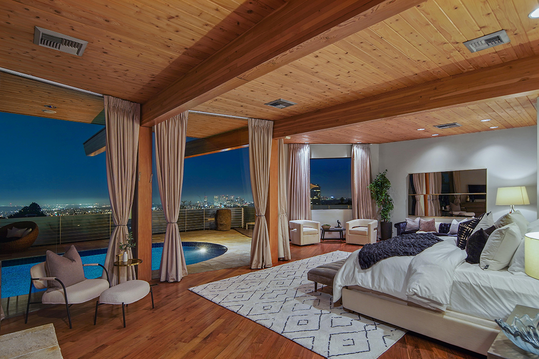 Design-wise, the 6,500-square-foot home has an organic yet suave look thanks to wood elements like the angled-slat front door, walls of glass, and pops of colder materials like stone and steel. Further highlights of the four-bedroom abode include a sunken “conversation pit” and a wet bar overlooking L.A.’s iconic hills. The entire home was clearly configured with fun and relaxation in mind, as the lower level holds yet another bar and a screening room for watching all your favorite Hollywood films. Meanwhile, in the primary suite, all you have to do is open the entire wall of glass doors and lay in bed to feel like you’re really in a poolside cabana.