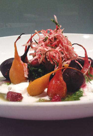 Veggie: Salt-roasted beets with Thai green curry and galangal coconut cream ($20). Chef Amanda Cohen marries yellow, red, and baby candy-cane beets with whipped coconut cream and a garnish of Thai basil, cilantro, and beet greens.
