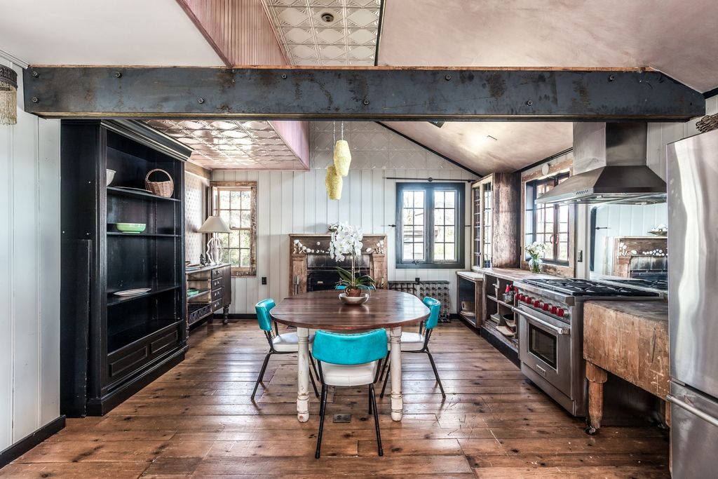 Design elements weaved throughout the house include bold wallpapers and tiles, rustic beams, and eclectic furnishings. One-of-a-kind, vintage pieces keep the interiors true to the structure’s age while elevating its style.