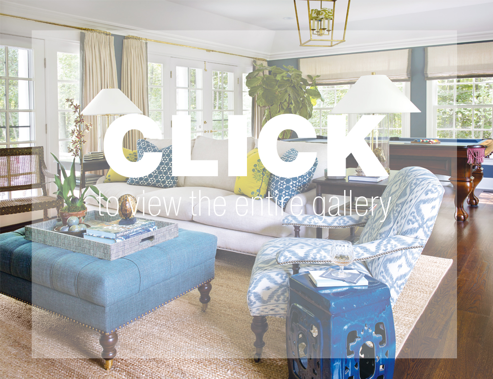 After revamping the layout and restoring some charm in the kitchen and family room, the designers were challenged with turning the living spaces into rooms that suited both small children and a crowd when entertaining. Taking a cue from the house’s bones and the client’s classic taste, Woodmansee and Clymer set out to marry the traditional with upbeat colors and a liveable lifestyle. “The client loves blue, but we wanted to incorporate other colors throughout,” notes Clymer. “She trusted us to push the envelope a little bit. We wanted to make sure there was a good balance of bold and traditional.” The designers kicked off their plan with the foyer, where they applied paneling and an acanthus-printed grasscloth to the walls—a major nod to that traditional side—but balanced it with a modern mirror and a funky console painted in a play-it-safe navy to make it more approachable. Says Woodmansee, “We wanted it to read traditional, but with a youthful freshness to it.”