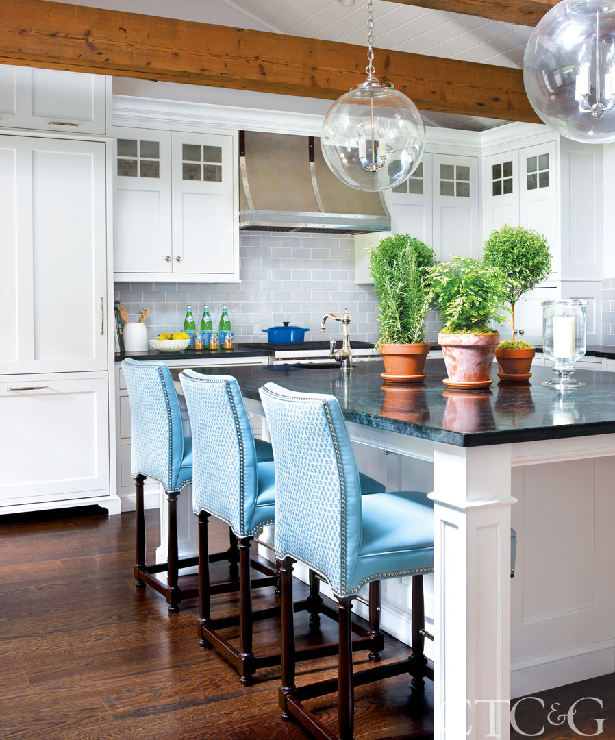 When a young family decamped from Tribeca to Connecticut, they found a house in Darien with loads of traditional charm and equal parts potential. The 1964 Colonial was renovated—badly—in the late ’80s, and the homeowners brought designers Stephanie Woodmansee and Elle Clymer of New York–based Henry & Co. on board to restore its historical charm and fill the space with appropriately scaled furniture, antiques and a family- and entertaining-friendly vibe. “The previous reno of the kitchen and family room area was scary—pink tile floors!” says Woodmansee. “The layout was choppy and kooky with skylights and weird angles. We wanted it to feel more cohesive and tie in the older characteristics of the house.”
