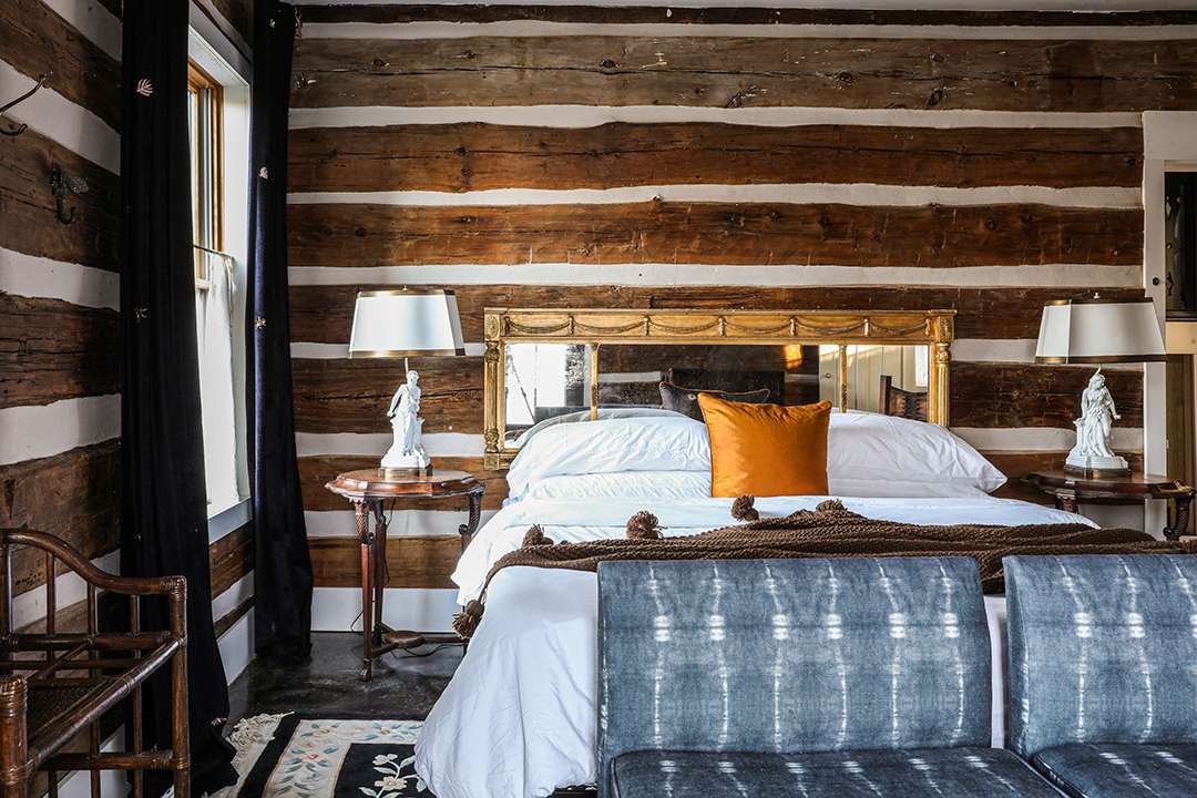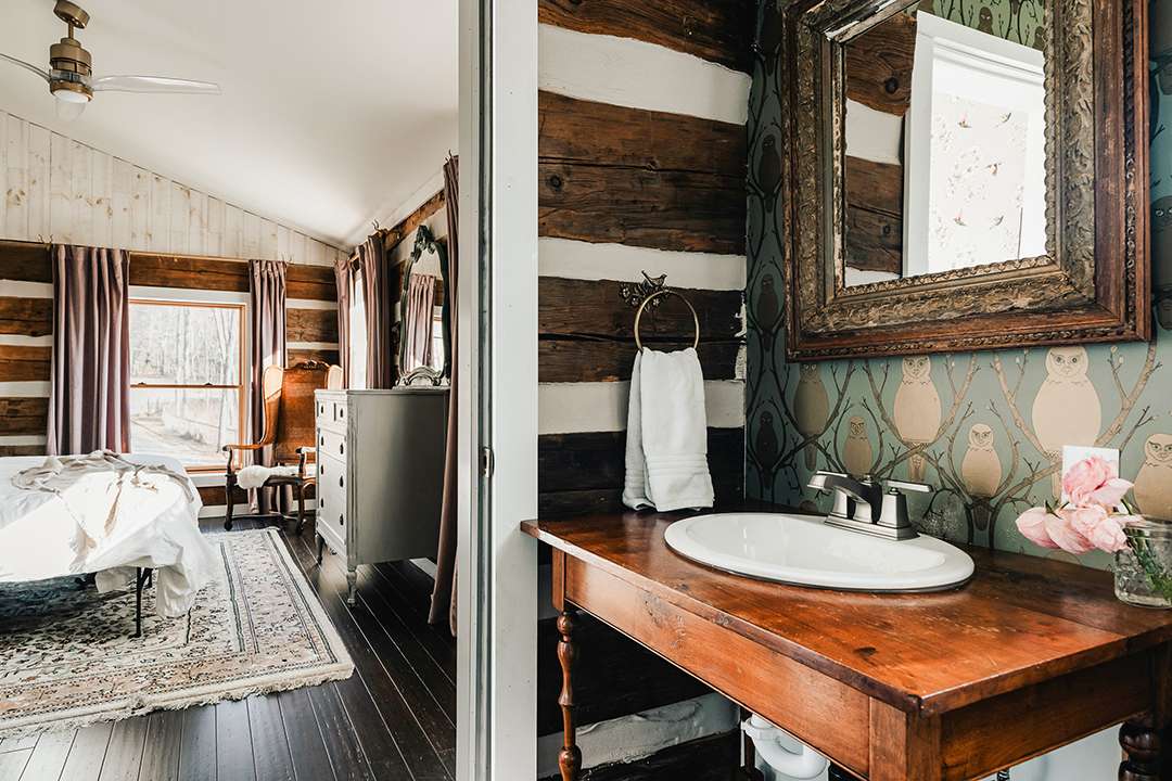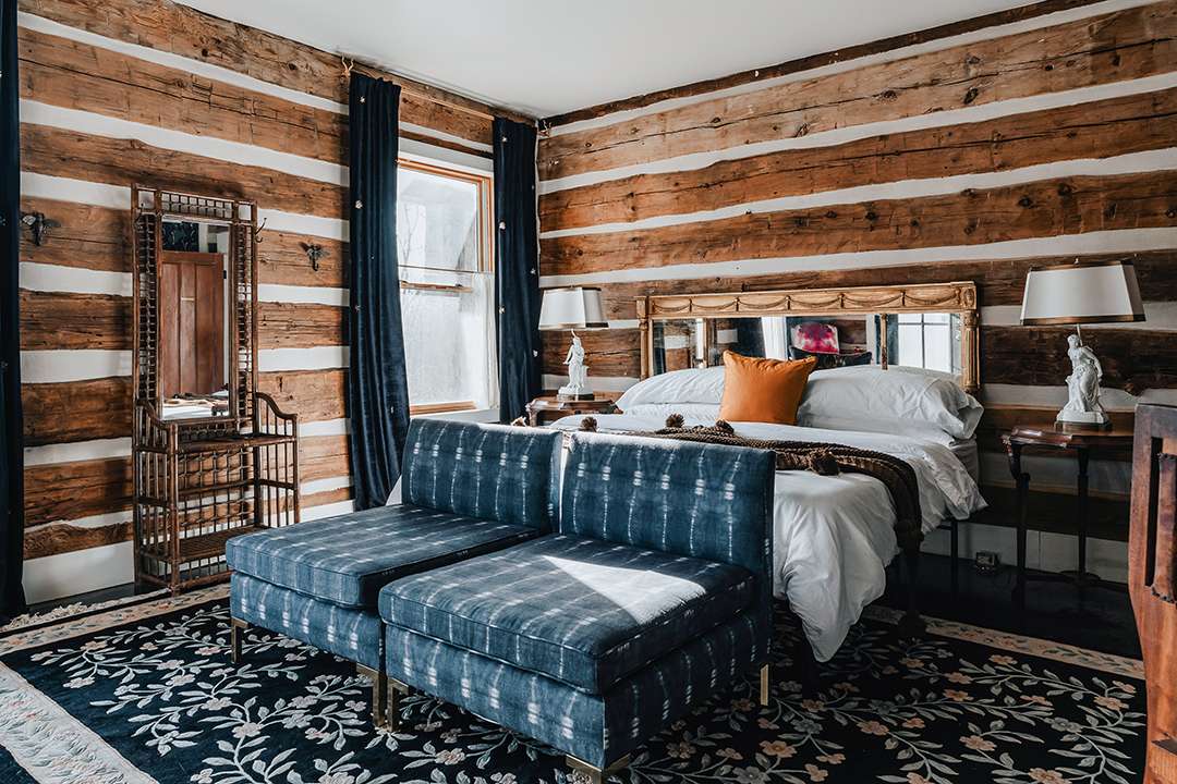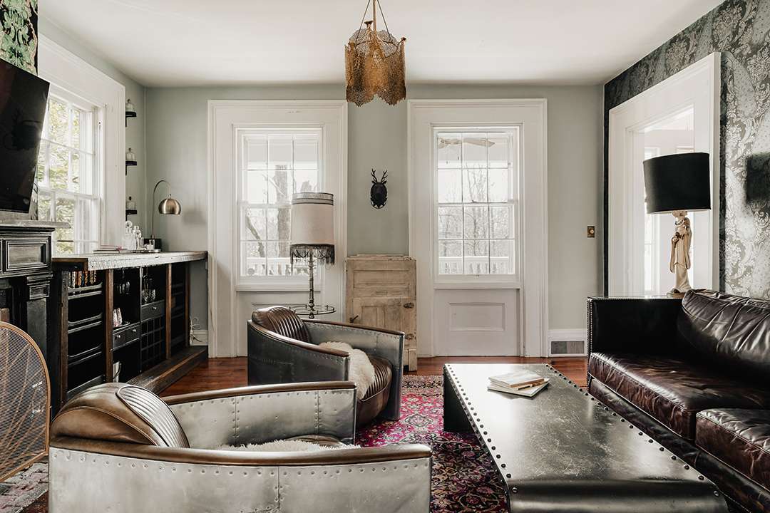 Arriving at the property today, upon first glance it gives the impression of just holding two charming farmhouses: A circa-1835 Greek Revival and a home made of reclaimed barn beams. However, what lies beyond their doors is lively and vibrant as well as utterly cozy. In both homes, a moody and dramatic vintage aesthetic unfolds, blending eclectic elegance with rustic Hudson Valley warmth. Exposed log walls, clawfoot tubs, striking wallpapers, and a black-painted staircase develop character and edge. Not to mention, between the two structures, there are eight bedrooms for fun-filled holiday celebrations.