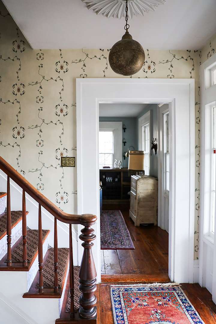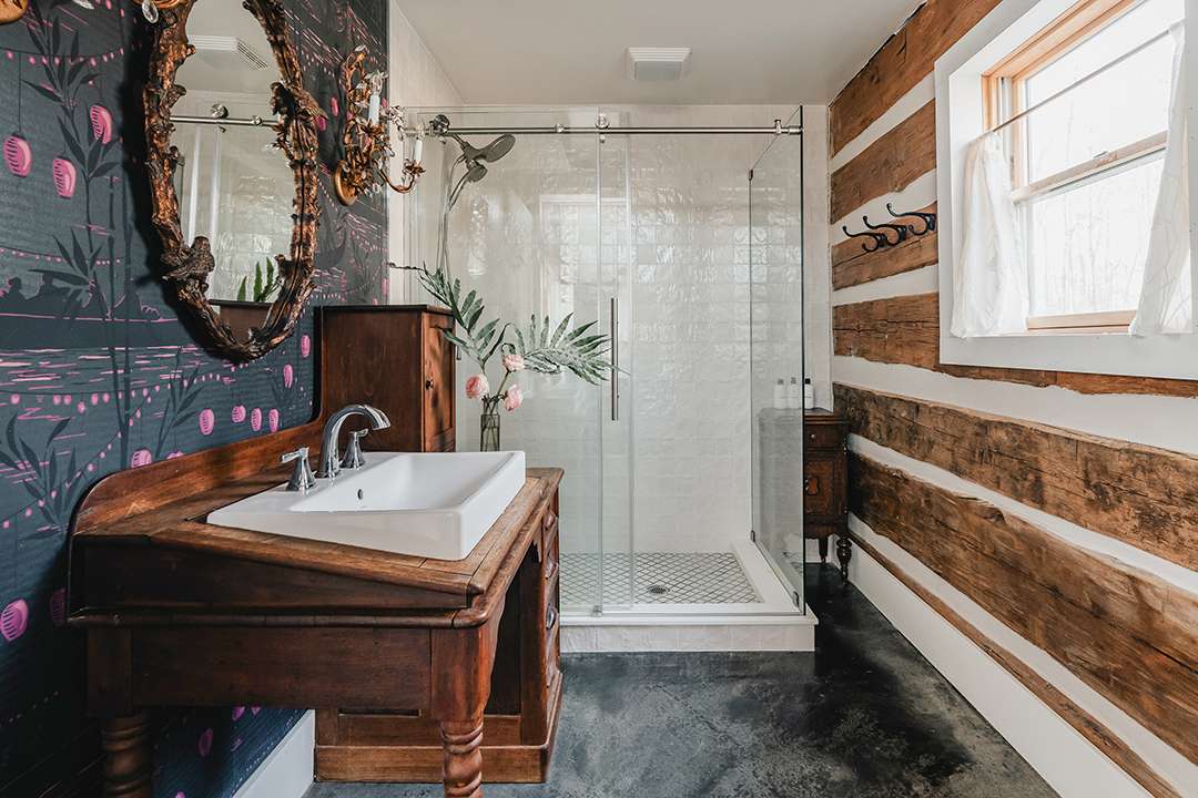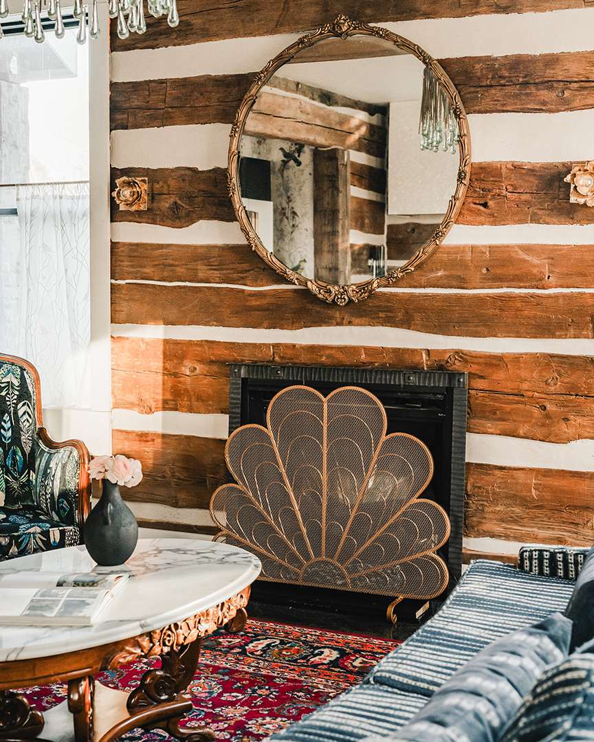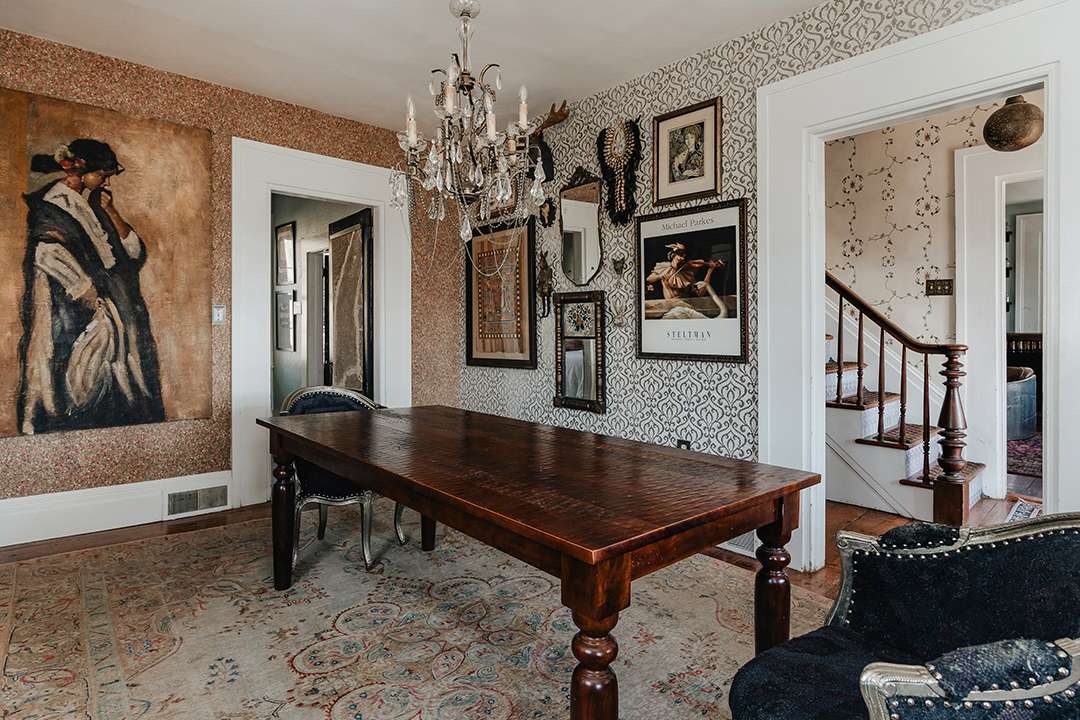 Arriving at the property today, upon first glance it gives the impression of just holding two charming farmhouses: A circa-1835 Greek Revival and a home made of reclaimed barn beams. However, what lies beyond their doors is lively and vibrant as well as utterly cozy. In both homes, a moody and dramatic vintage aesthetic unfolds, blending eclectic elegance with rustic Hudson Valley warmth. Exposed log walls, clawfoot tubs, striking wallpapers, and a black-painted staircase develop character and edge. Not to mention, between the two structures, there are eight bedrooms for fun-filled holiday celebrations.