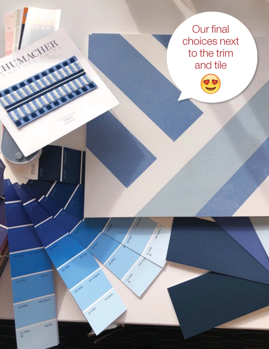 The real test, of course, was to place the color next to the tile samples. In addition, we were adding a simple white linen curtain with a decorative trim (both from Schumacher) that had a few shades of blue.