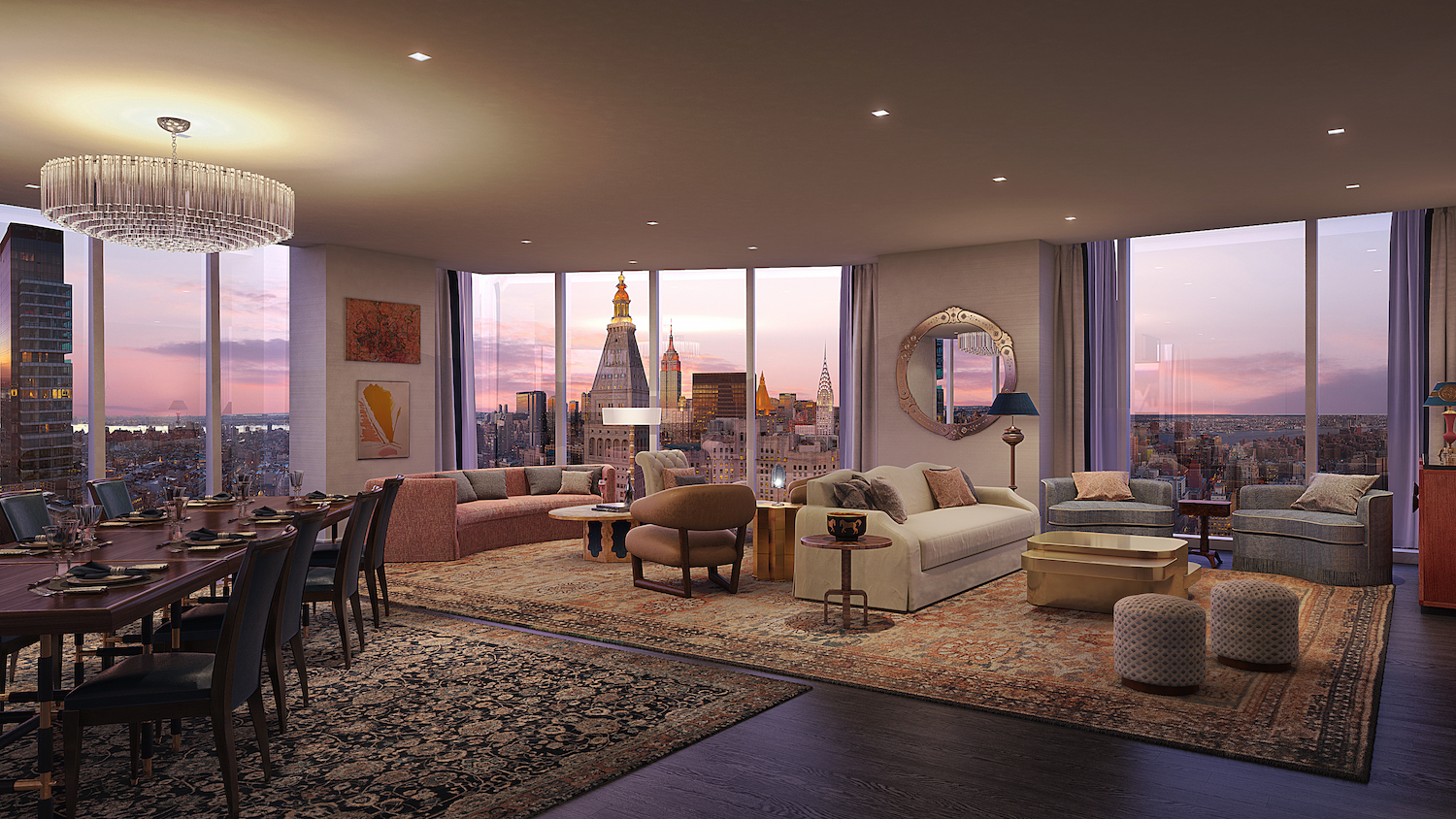 Prominently positioned on Billionaire’s Row, 252 East 57th Street is 65 stories of complete luxury. International architectural firm SOM designed the building while AD100 architect and designer Daniel Romualdez designed the interiors, including the 34th Floor Club that houses a pristine dining room.