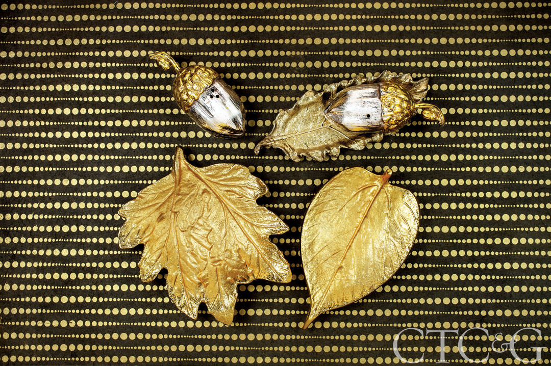 This acorn salt-and-pepper set with a sculptural leaf tray adds a flourish to any dining table. Zodax three-piece set, $60, Hoagland’s, Greenwich, hoaglandsofgreenwich.com. These brushed-gold leaf dishes make the perfect catchall. $15 each, Party Party, Fairfield, partypartyfairfield.com.