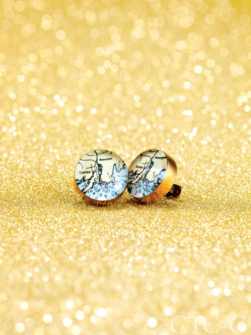 Handcrafted in Maine, these unique cufflinks are outfitted with local maps of Darien. Navigator cufflinks in bronze, $98, Kirby and Company, Darien, kirbyandcompany.com.
