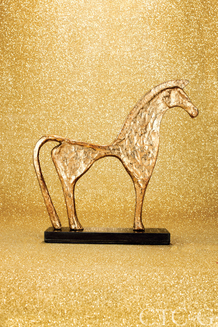 SM Home’s cast iron, gold leaf horse statue stands tall on a sleek marble base. Greek Trojan-horse statue, $150, Greenwich, sandramorganinteriors.com.