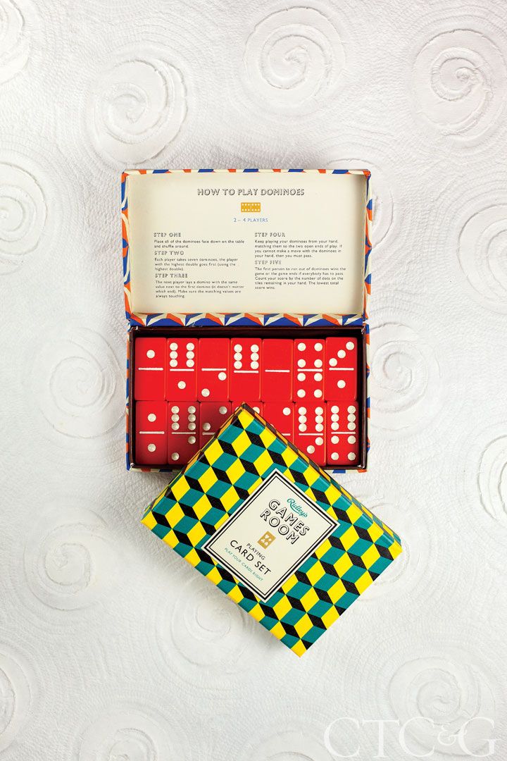 Get snowed in with these dominoes and playing cards from Town House Finds + Designs. Dominoes, $22, playing card set, $20, Darien, townhousefinds.com.