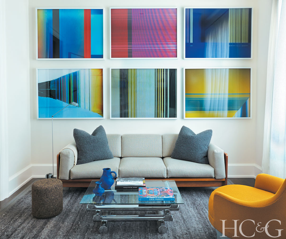 Works by Penelope Umbrico hang above a sofa covered in a Holly Hunt fabric. A vintage armchair and Italian bookcase from R. E. Steele strike a balance with a sleek desk from Kartell. The vintage Gambone lamp is from Robert Stilin.