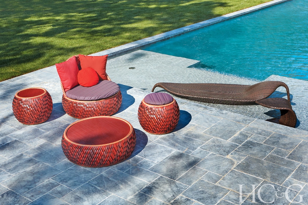 Pieces from the Dedon Dala collection are arranged both next to and in the pool.