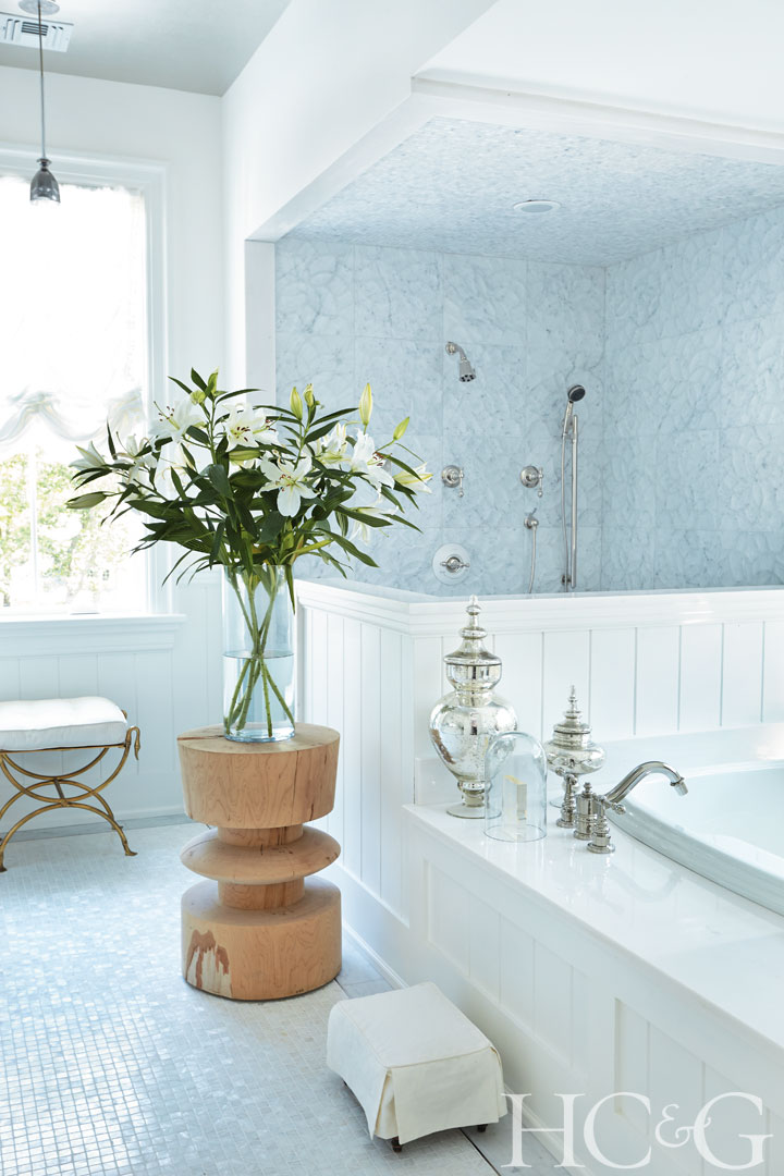 The adjacent bath features a Shelly Tile floor and accessories from Gracious Home.