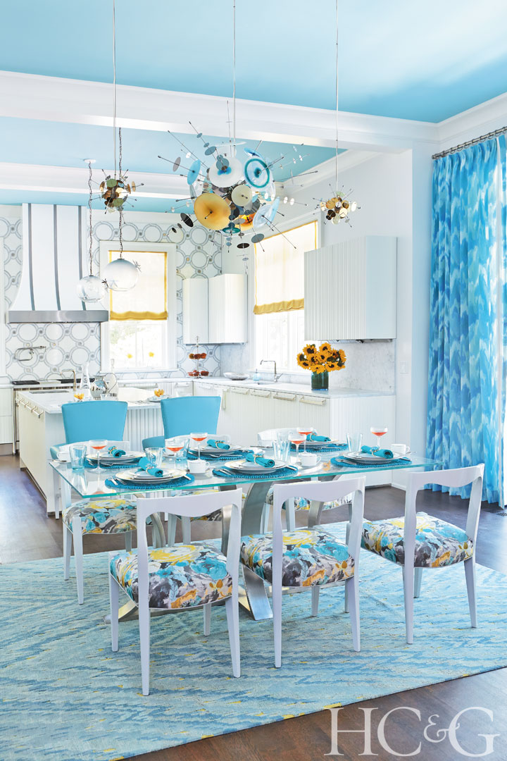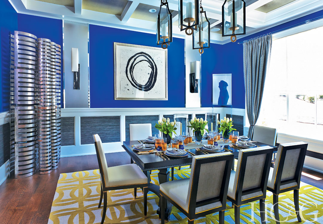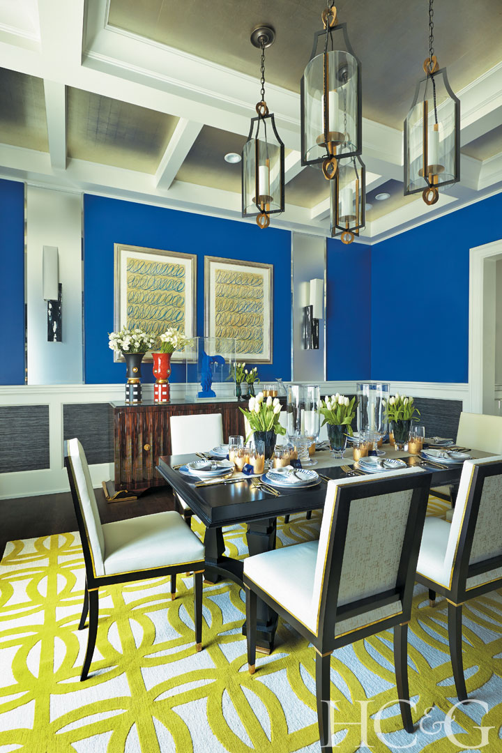 Designer Richard Mishaan’s homage to Yves Klein makes use of the French artist’s trademark blue; an acid yellow area rug from the Rug Company turns the space into a feast for the eyes. Tableware is from Lenox and NameBaccarat.