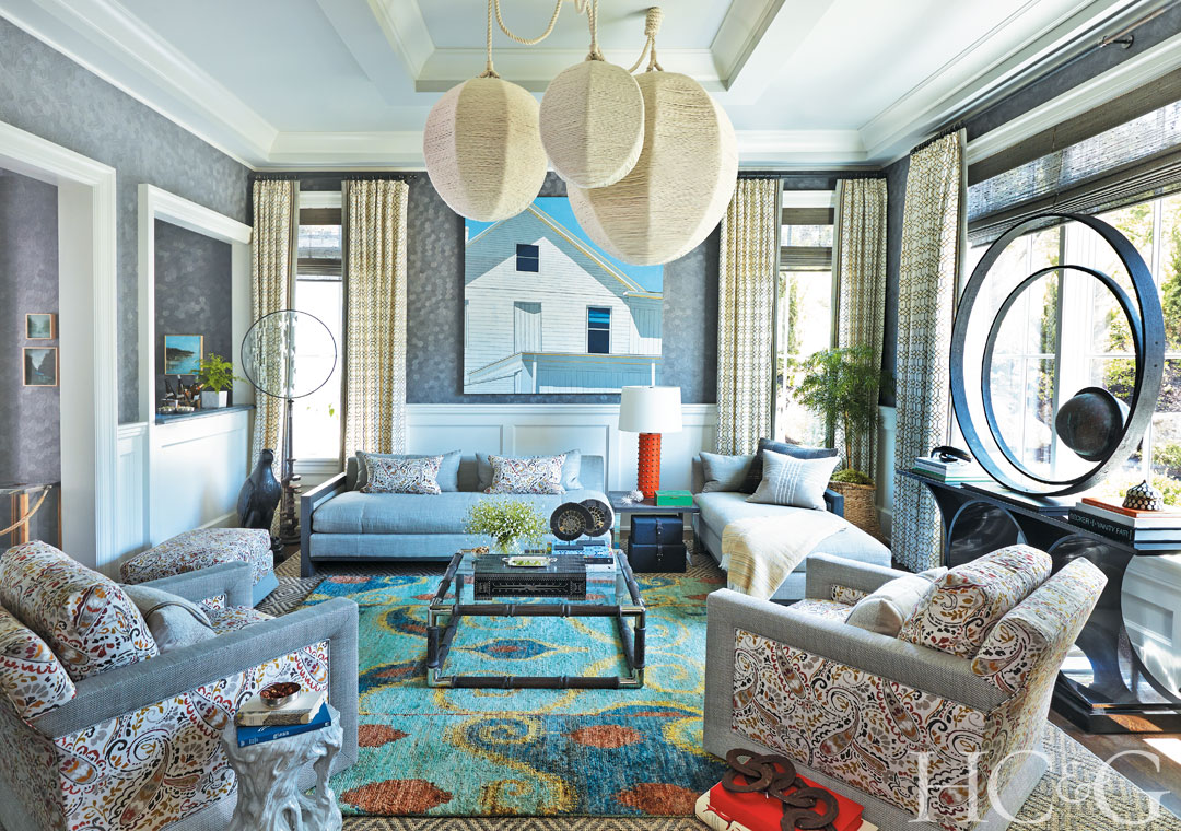Relaxed, classic, and modern at the same time, with a sense of privacy and warmth that makes it feel like a retreat, decorator and television personality Thom Filicia’s design includes pieces from his new collection of furniture and fabric for Kravet. “I’ve dedicated this room to my mother, who passed away far too early from breast cancer,” he says. “She encouraged my creativity and motivated me to celebrate each day as if it were a holiday.” Thom Filicia’s living room includes a stunning rope-wrapped light fixture that hangs above a rug from Safavieh and furnishings from the designer’s new collection for Kravet; the Karl Springer console is from Craig Van Den Brulle.