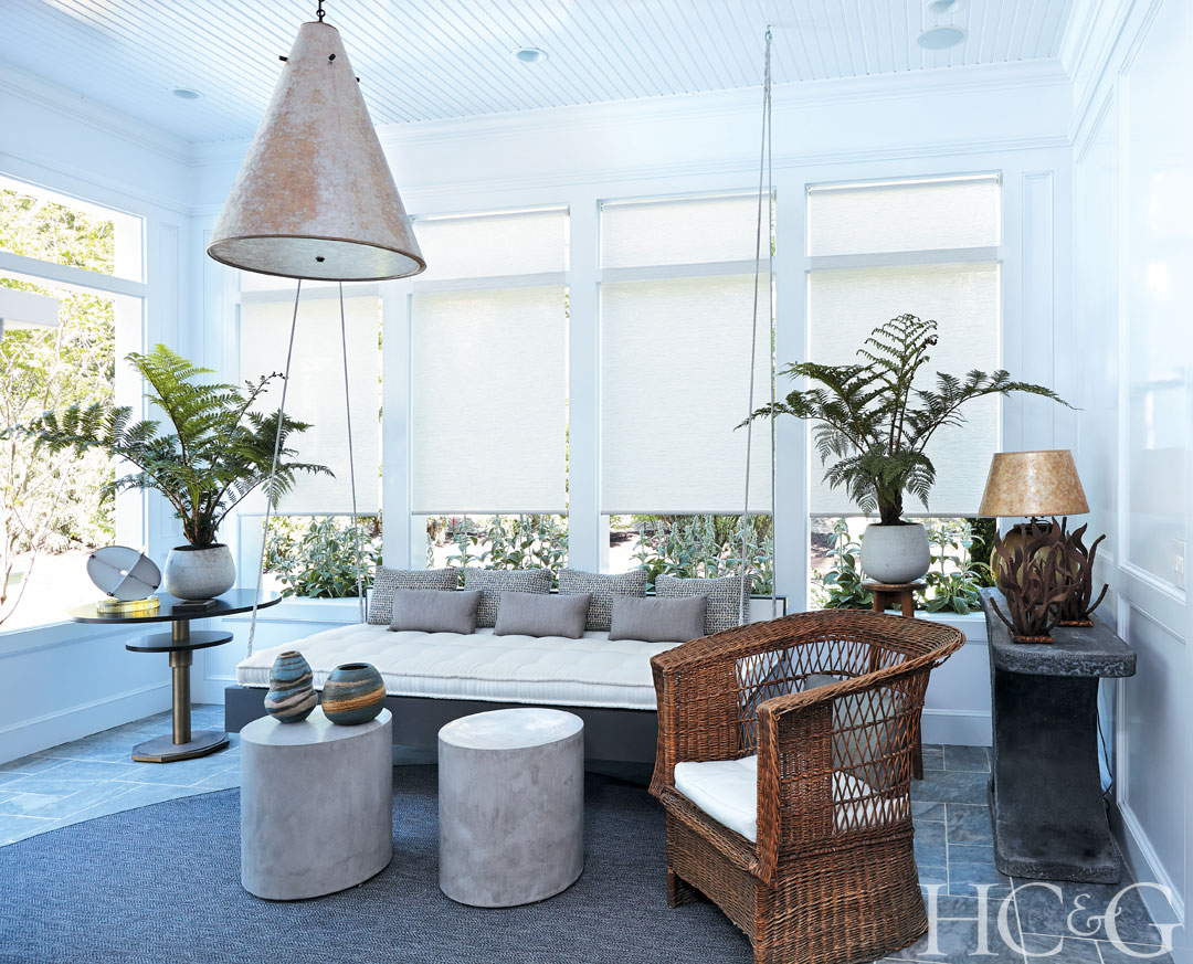 “We wanted the room to function differently from a typical sitting area,” says principal James Huniford. “Inspired by a tree swing, we hung a daybed from the ceiling, bringing a sense of the outdoors into this transitional space.” In the screened porch, two vintage Gustav Stickley wicker chairs commingle with contemporary seating pieces and accessories from Huniford Collection.