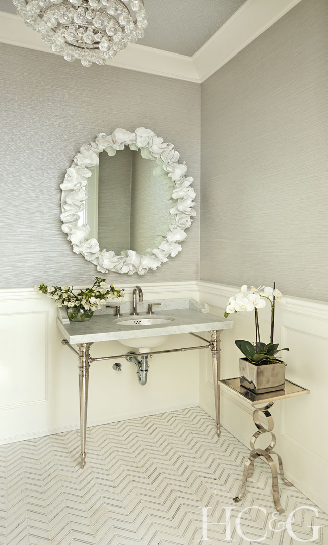 Silver wallpaper and shimmery tile create a “jewel box” effect; a shell-studded mirror, an occasional table, and a Kallista sink from Klaff’s provide a complementary circular motif. Susan Glick’s powder room includes tile from Shelly Tile and wallpaper from Jab Anstoetz.