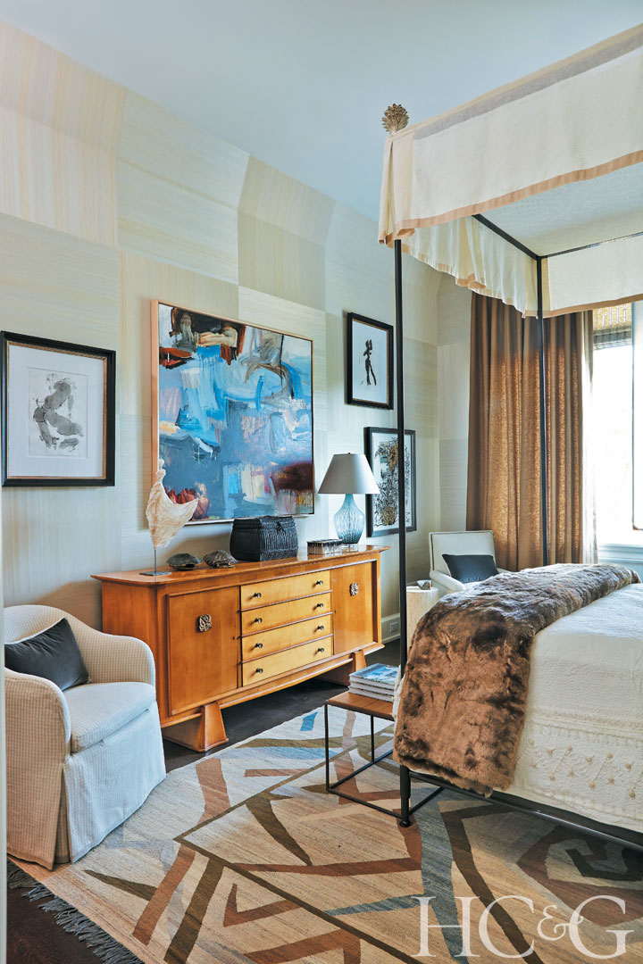 “It’s always easier to decorate a room that’s filled with natural light,” says Howard. “Inspired by my fellow Southerner Albert Hadley, I just added a little luxury.” In the junior master suite, an abstract work by Michael Rich hangs on a wall covered in a silk and abaca pattern from Phillip Jeffries; the indigo and sepia area rug is from Antique Rug Galleria. The 1940s French sycamore sideboard is from Newel; most other furnishings are from Mrs. Howard.