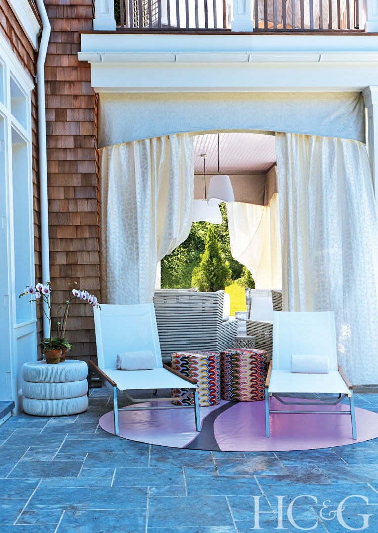 “I wanted to capture that sense of euphoria and relaxation after a long summer day at the beach by creating a great hangout,” says Bolognino. “But it’s an outdoor space, so everything had to be waterproof and be able to stay put in case of stormy weather!” Elizabeth Bolognino’s pergola-framed surf shack includes furniture and pillows from Dedar and Serena & Lily. The rug is from Dash & Albert.