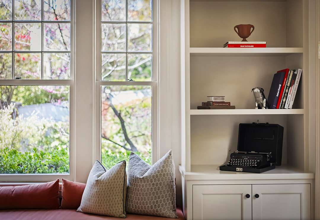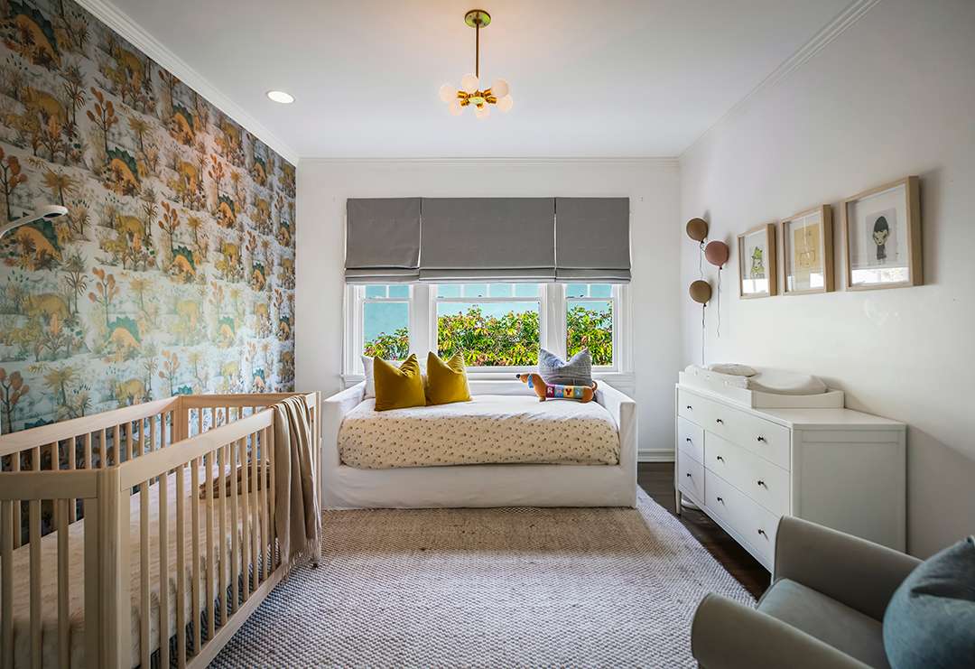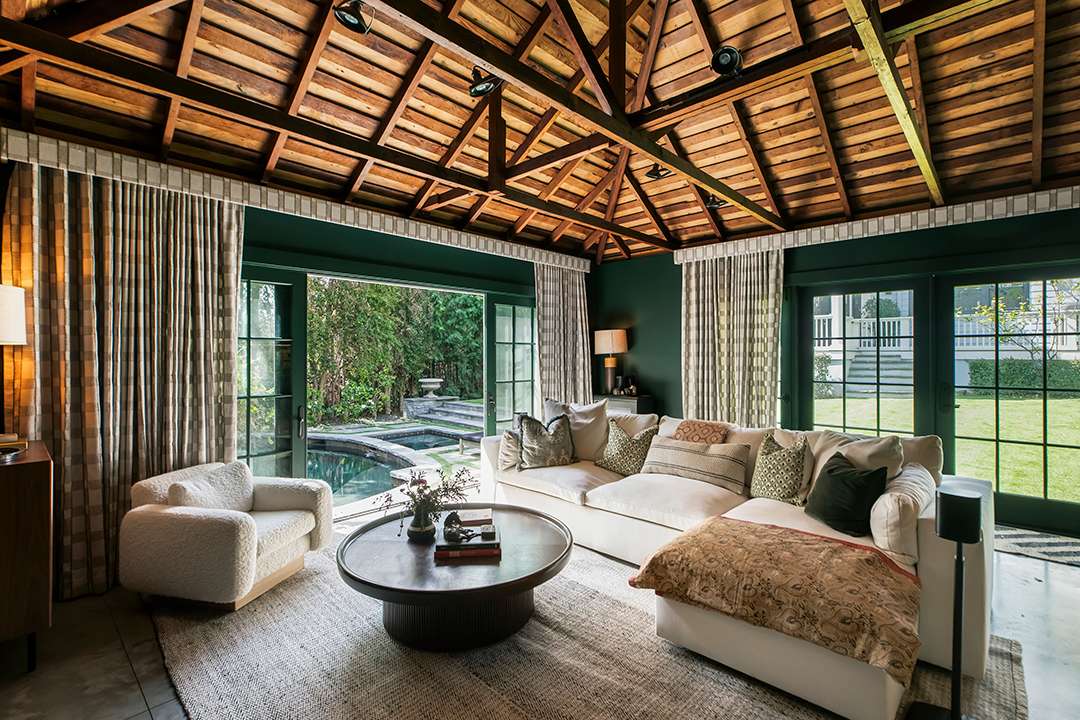 A red front door beckons visitors into the 4,359-square-foot residence with polished interiors by Jillian Kliewer The upscale yet inviting home doesn’t scream “celebrity” with loud or flashy style, but offers a timelessly elegant environment. Downstairs, a gorgeous kitchen, living spaces overlooking the yard, a wet bar, dining room, and fireplaces allow for stylish entertaining. Outside, a swimming pool, large lawn, and pool house (or, detached work space) sweeten the deal.