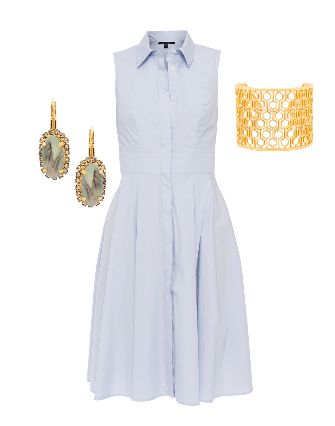 XANDER Pale Blue Pleated Cotton Shirt Dress, $480; JULIE VOS Casablanca Gold Cuff, $210; ELIZABETH COLE Marble and Pearl Earrings, $95; available through Halsbrook.com. B-LOW THE BELT Leather Wrap Belt, $120, coming soon.